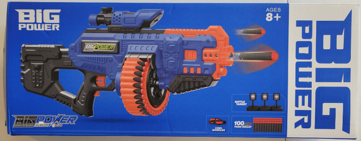 Unlike our previous orders via Ali Express, this came from Amazon and with a bit more bling in the packaging. While now being bright blue and featuring photo art and branding, it was still “frustration-free” style content. Inside we find 100 of the Bai Hui style dome tip darts, the blaster, a single drum, a pair of snap-in drum shields, a cute little practice target, a set of dubiously safe goggles, an N-Strike compatible scope, and 6 AA batteries. Each of the BaiHui blasters appears to be packaged multiple ways, so it is entirely likely you could end up with different contents beyond the blaster and its bits. For purposes of this review, we’re going to disregard the goggles and targets.