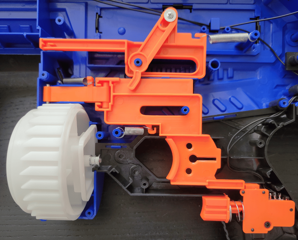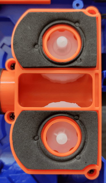 The internals are straightforward. The cage is like the one in the BIG101, complete with dampening foam and serrated crushed wheels. The mechanical side of the blaster is also pretty self-explanatory – not much we haven’t seen elsewhere though the designers seem to have a preference for extension springs. If you’re looking to run an upgrade there is plenty of room in the shell and the battery stock should handle a decent-sized