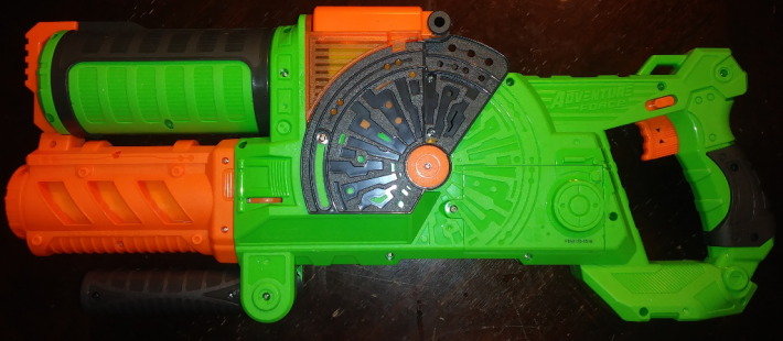 The unique feature to this blaster is that it is hopper fed. The hopper opens with a two-part hinge, allowing both the top to flip back completely and the back wall of the hopper to pivot back about 45 degrees. This pivot point helps tamp the darts into place for proper firing when closed. The hopper lid also contains a light descending platform that helps gently push the darts down as the blaster fires. This helps with crushing the darts like a spring load might. Darts feed into the flywheels assisted by a pair of angled flappers at the bottom of the hopper which in turn drops the dart onto a slightly toothed belt and ultimately struck by the pusher arm into the flywheels.